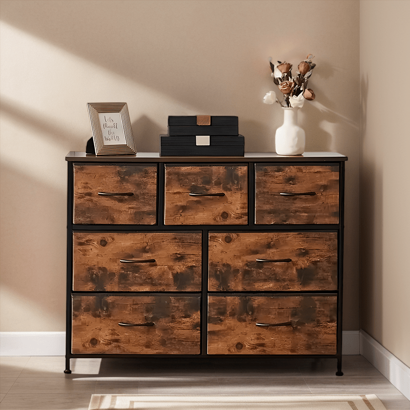 7-Grid Fabric Drawer Organizer – Metal Frame, Wooden Top, Multi-Room Storage Solution