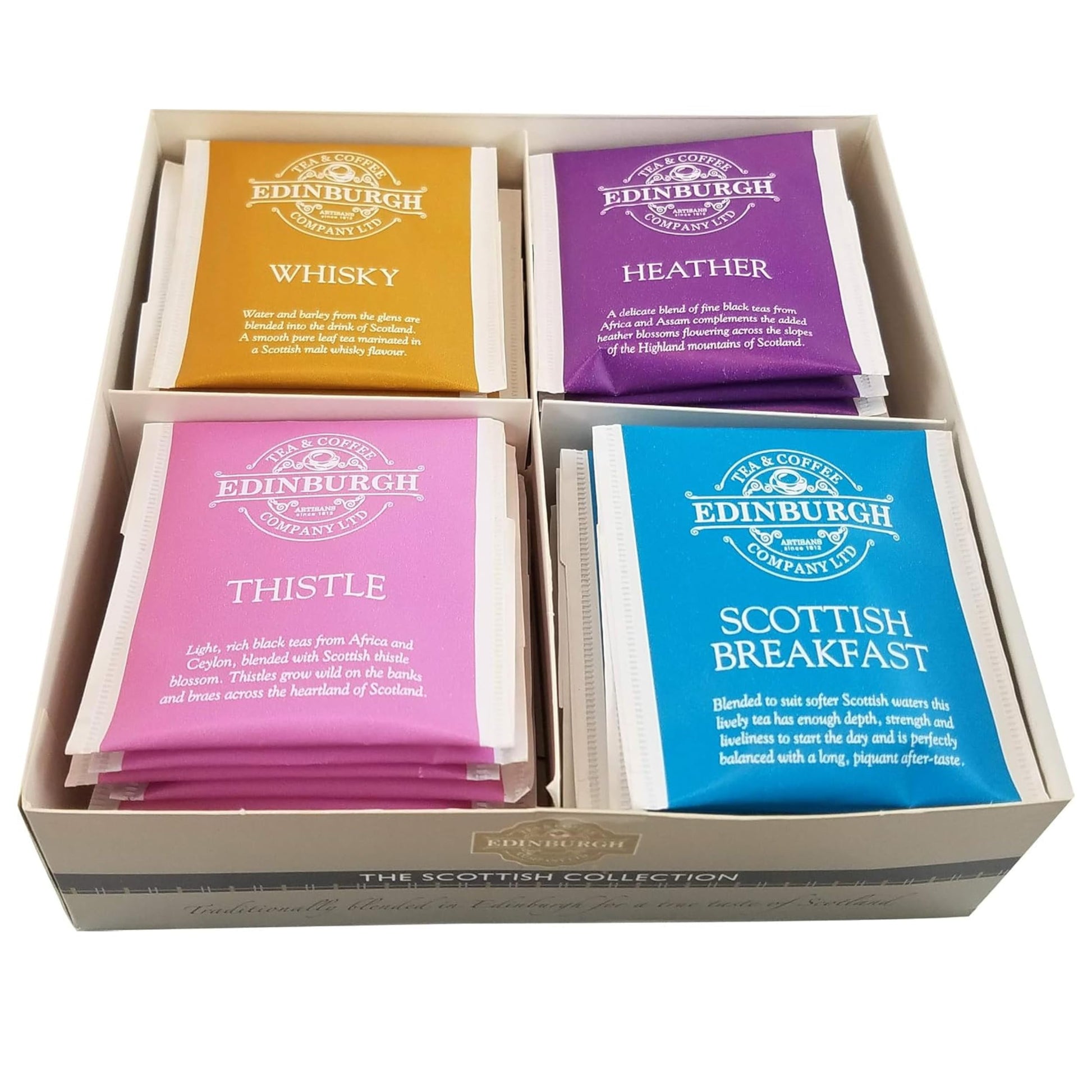 Discover the Edinburgh Tea & Coffee Company's Scottish Collection, a unique 4-flavor variety pack that brings the essence of Scotland to your cup. This exquisite selection features 40 string and tag teabags, with 10 of each traditional brew, ensuring a delightful experience with every sip.