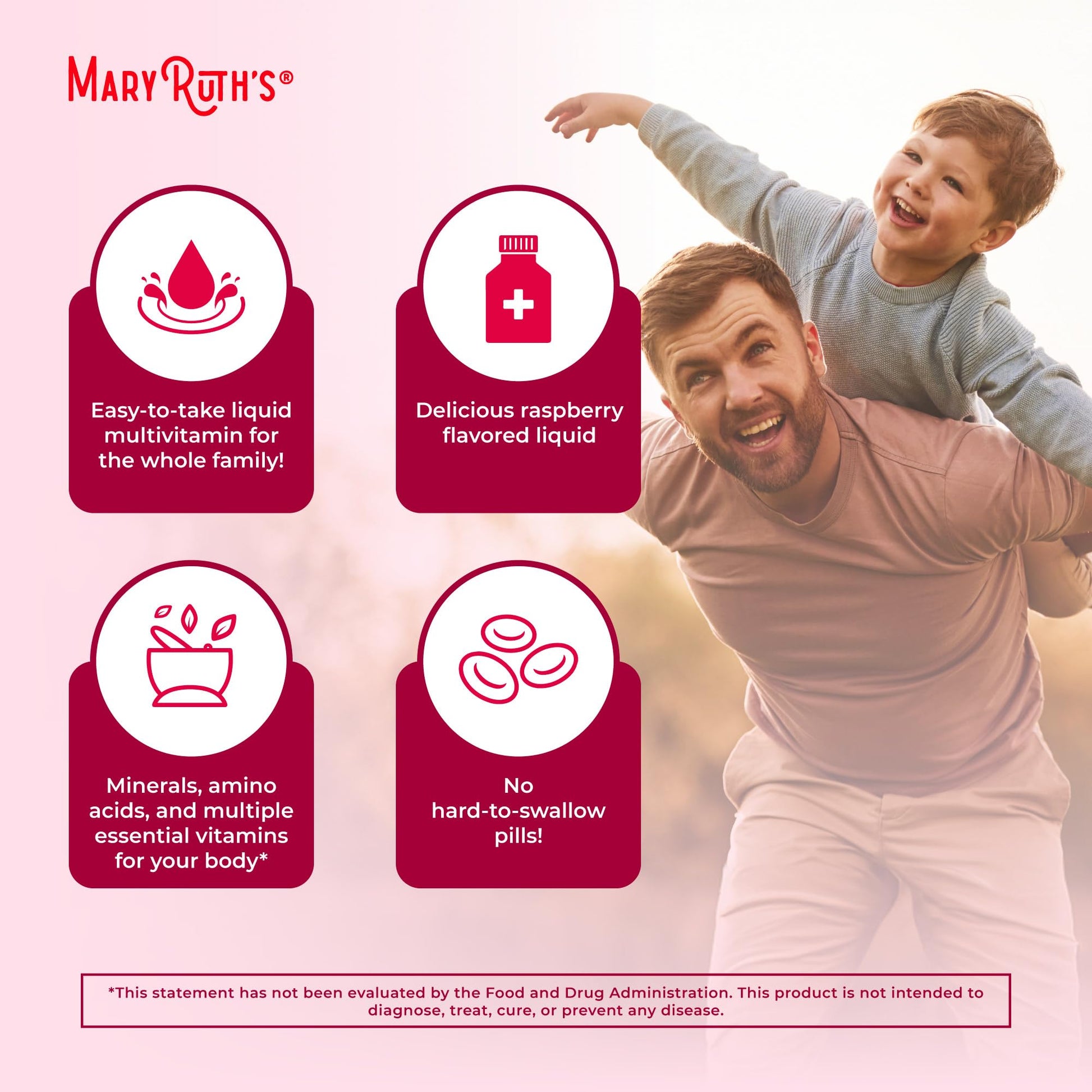 MaryRuth Organics Morning Multivitamin for Women, Men & Kids is a unique liquid multivitamin designed for the entire family. Unlike traditional pills, this delicious Raspberry formula offers a convenient way to meet daily nutrient needs without the hassle of swallowing hard tablets.