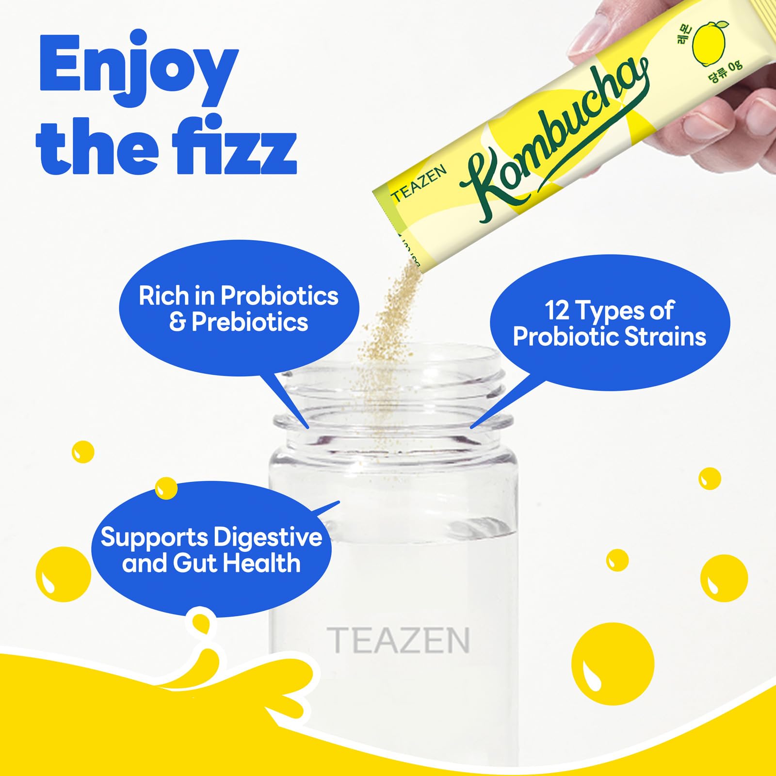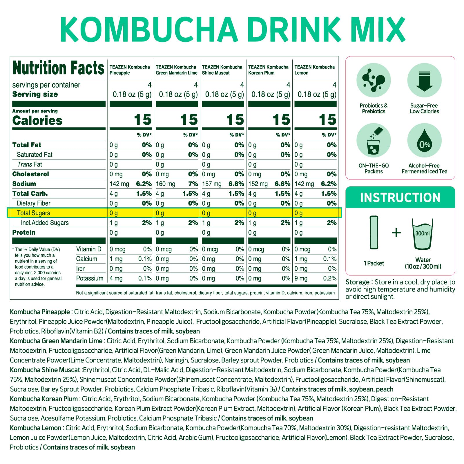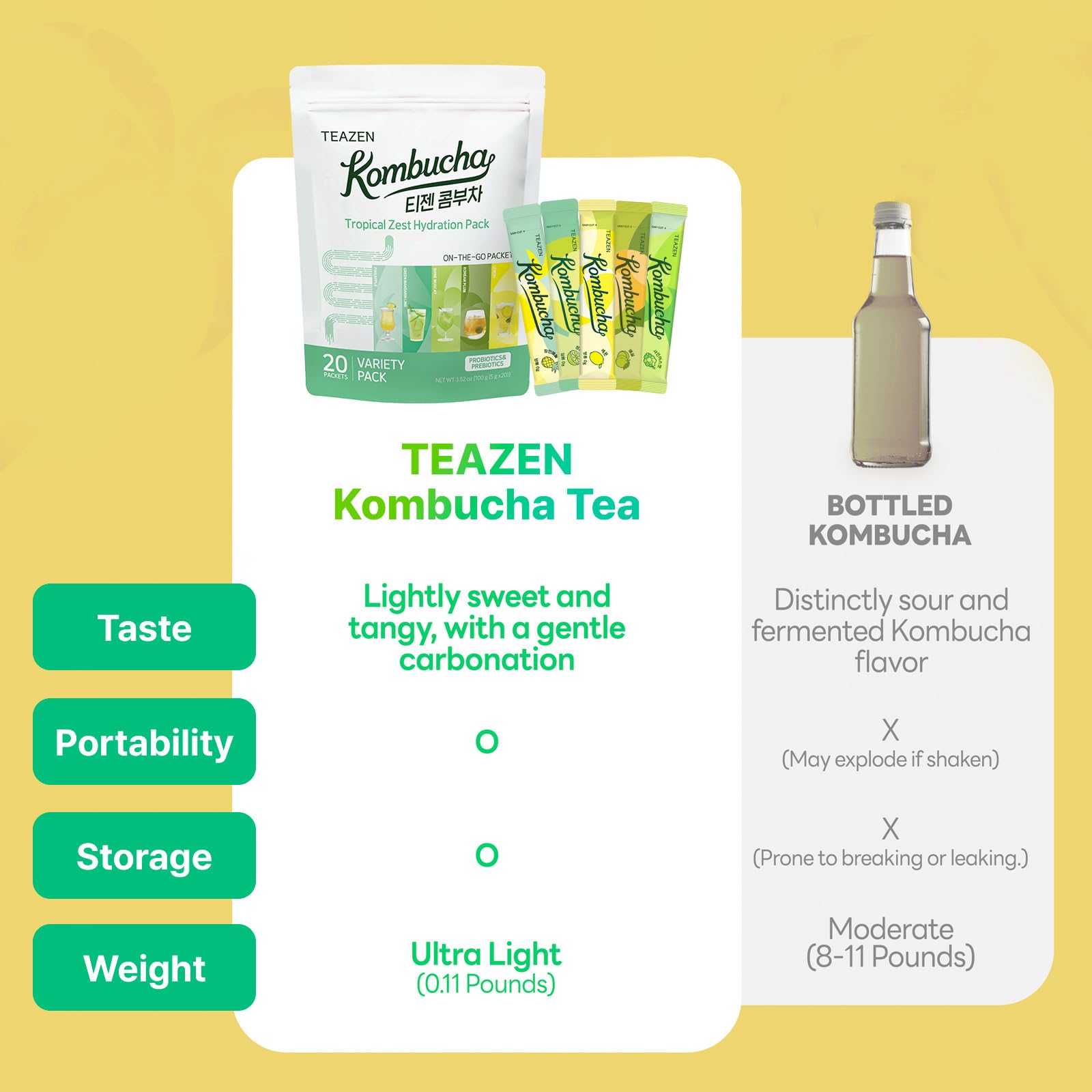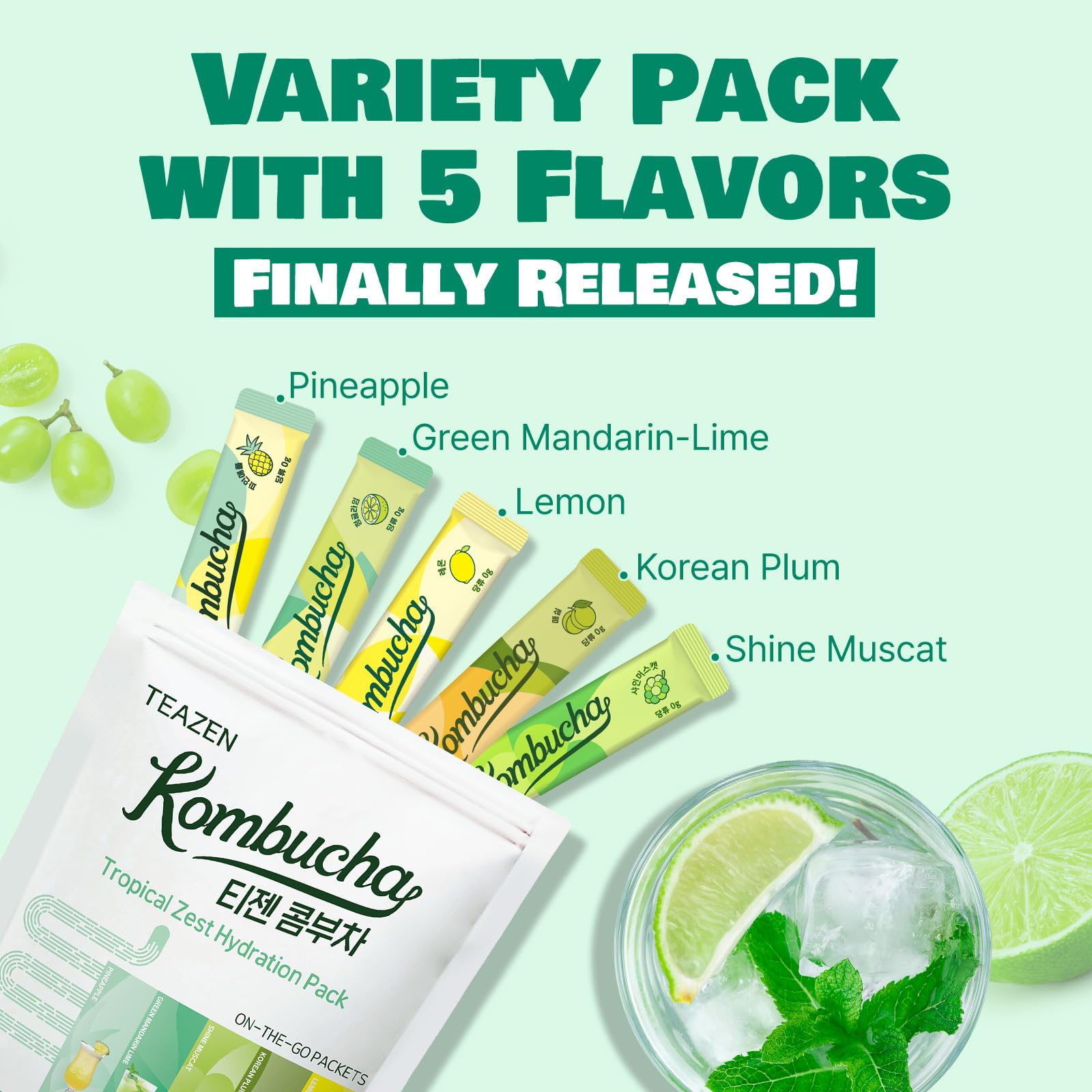 Experience the vibrant flavors of TEAZEN Kombucha Tea Tropical Zest Hydration Variety Pack. This unique collection features 20 sticks, offering five delightful flavors: Lemon, Pineapple, Korean Plum, Shine Muscat, and Green Mandarin-Lime. Each stick is a burst of tropical zest, perfect for those looking to explore the best of Korea's kombucha.