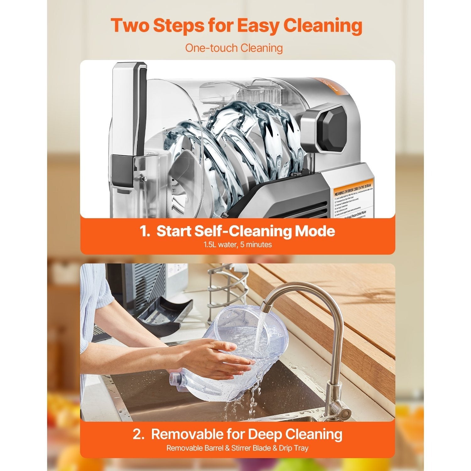 Features a self-cleaning mode for quick maintenance. For deep cleaning, unlock the rear handle, remove the barrel and parts, and rinse or place them in the dishwasher. A removable drip tray keeps your countertop tidy.
