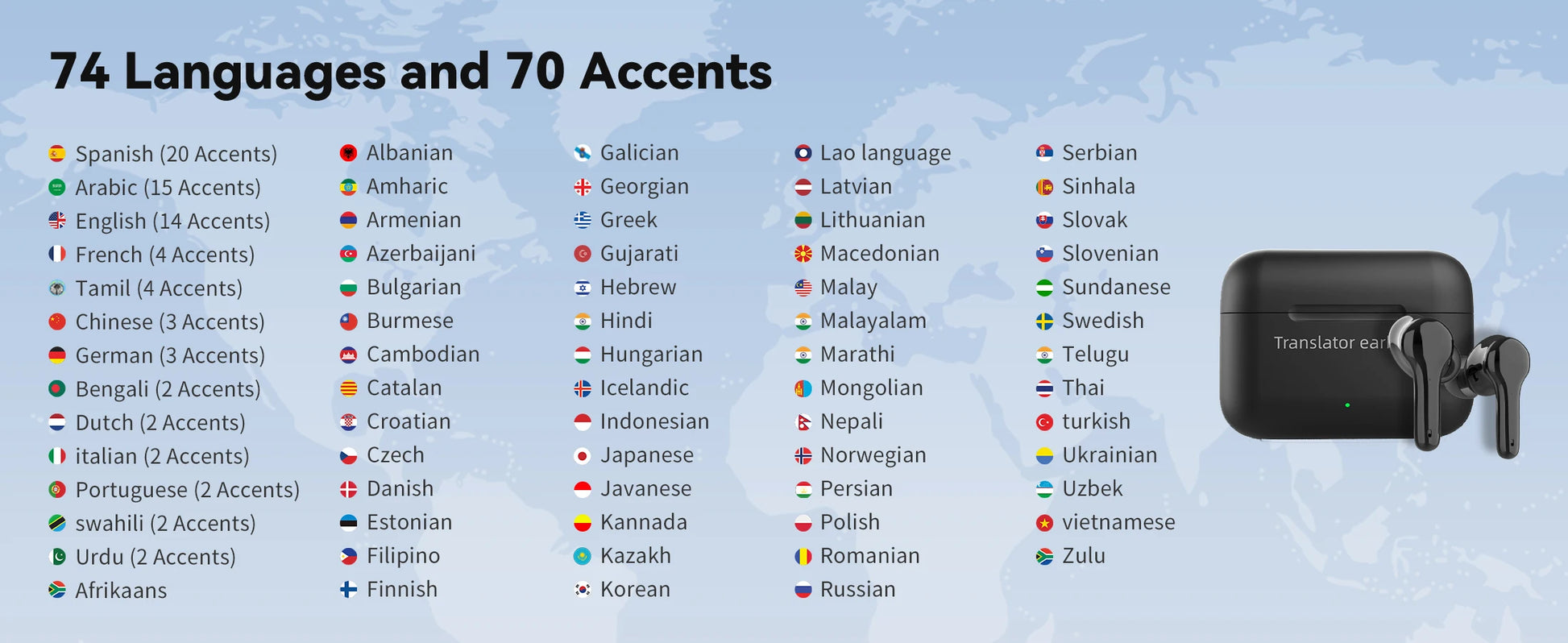 ▪ 144 Languages + 70 Accents – Communicate anywhere with real-time two-way translation, plus 11 offline packs for use without internet.